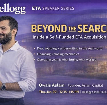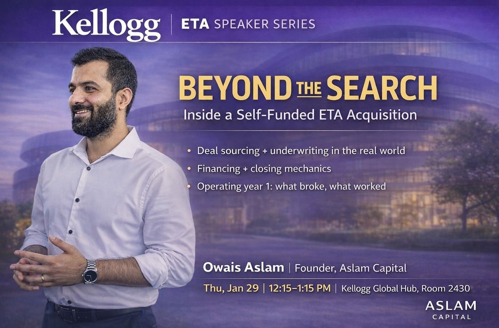 Owais Aslam spoke at Kellogg this week on self-funded entrepreneurship through acquisition—and kept the session deliberately practical. Rather than spending time on “search theory,” he walked the room through an actual deal from end to end: how it was sourced, why most opportunities they evaluated didn’t meet the bar, how the acquisition was financed without a fund, what broke in the first year, and what he would do differently next time.
